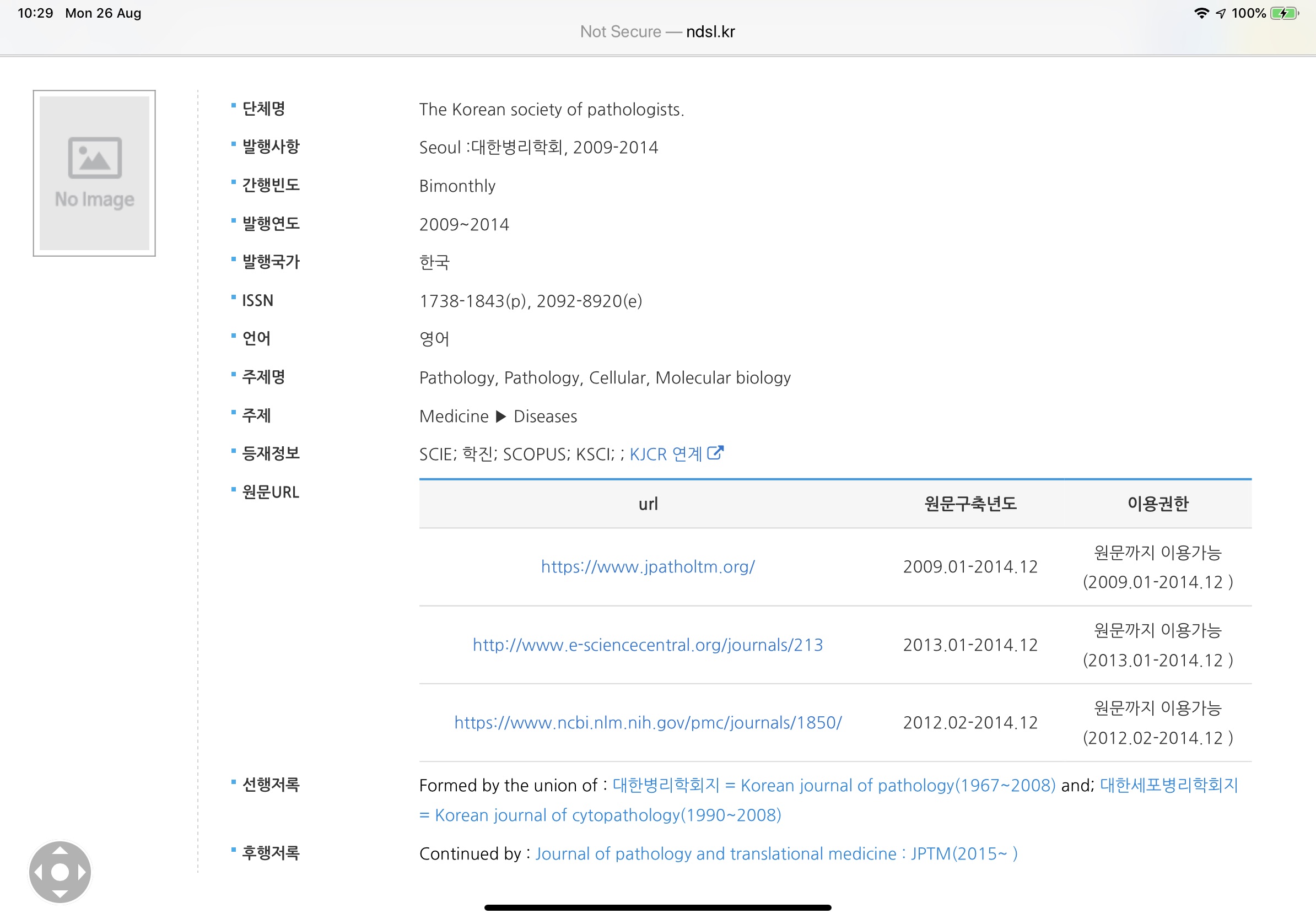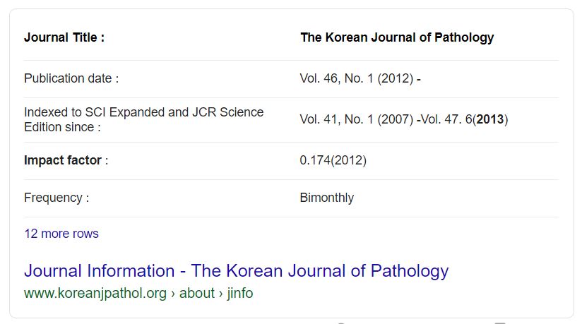 심하게 말하면 아무도 읽지 않고 아무도 사지 않고 아무도 인용하지 않는 저널로 떨어졌을 가능성이 많다. 실제 이 저널은 실패한 저널이다. 런칭한지 5년 되던해 종간했고 새 저널로 갈아 탔다. 내부적으로 대한 병리학회의 학회지 일지 모르지만 외부적으로 전혀 다른 저널이다.