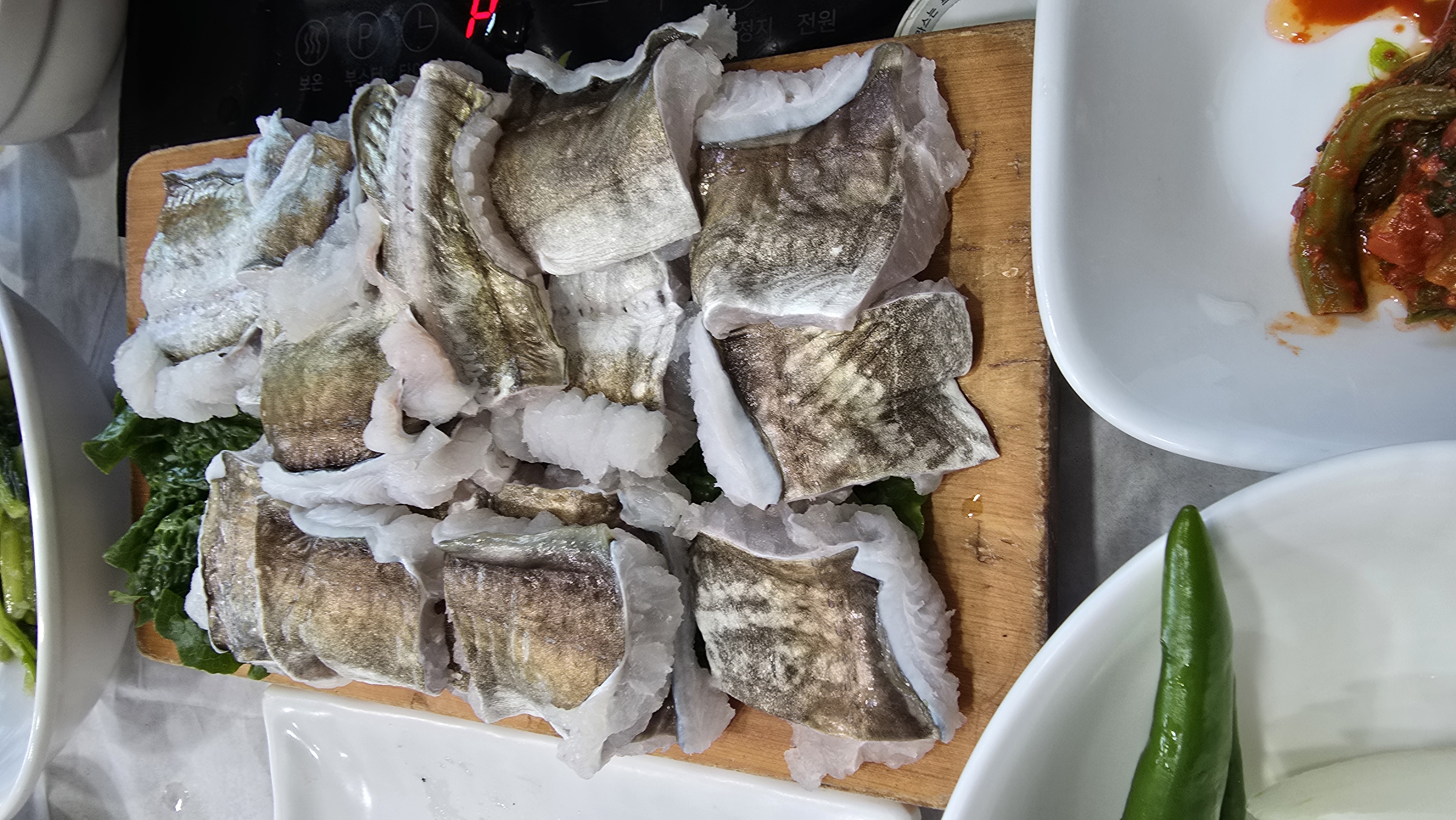 하모는 갯장어를 뼈를 다져서 육수에 잠깐(15초) 담갔다가 채소에 마늘, 양파, 쌈장들을 넣고 쌈을 싸서 먹으라고 한다.